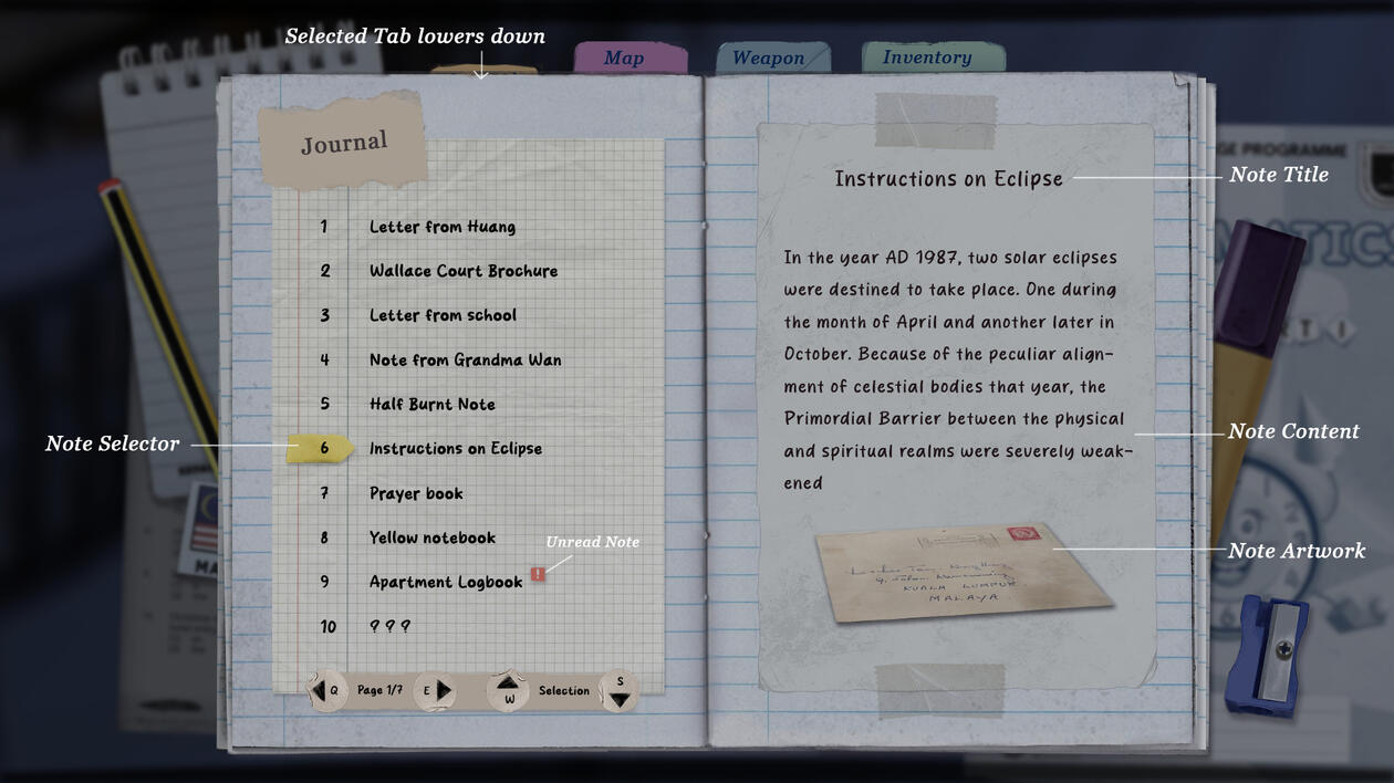 The main challenge was to create two separate UIs for each coop player to visualize their distinct personalities. This was shown through the journal and organization of their notes.